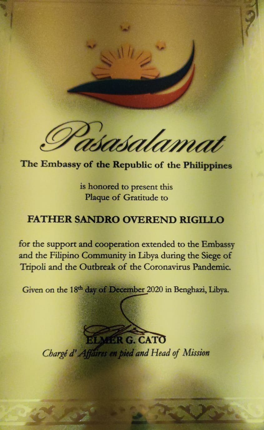 The Philippines’ Ambassador, His Exc.Elmer G Cato, while visiting The Filipino communities in Benghazi and Tobruk, presented P. Sandro Overend Rigillo,ofm, Apostolic Administrator in Benghazi, a Plaque of Gratitude for his presence and continued caring to the Filipino Community during the outbreak of the Corona Virus. The celebration was held on the 18th Of December in Benghazi.